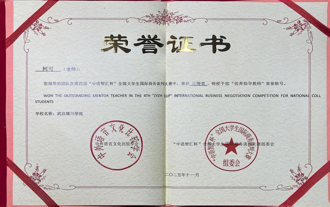 (通讯员:柯可 编辑:刘小丹)近日,在第四届“中语智汇杯”全国大学生国际商务谈判大赛全国总决赛中,william威廉亚洲(中国)有限公司外国语学院与来自全国高校的143支晋级队伍同台竞技,团队(成员:王德琳、周欢、刘畅、陈盈盈)在柯可、舒亚琴两位教师的指导下,凭借扎实的功底、稳定的发挥与出色的团队协作,最终荣获全国三等奖。柯可、舒亚琴老师获评“优秀指导教师”,柯可老师还应邀担任了本届大赛全国总决赛的评委。