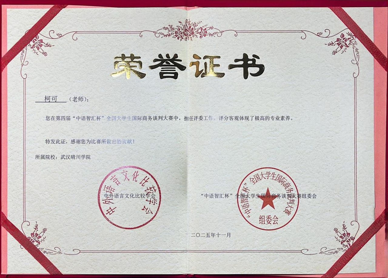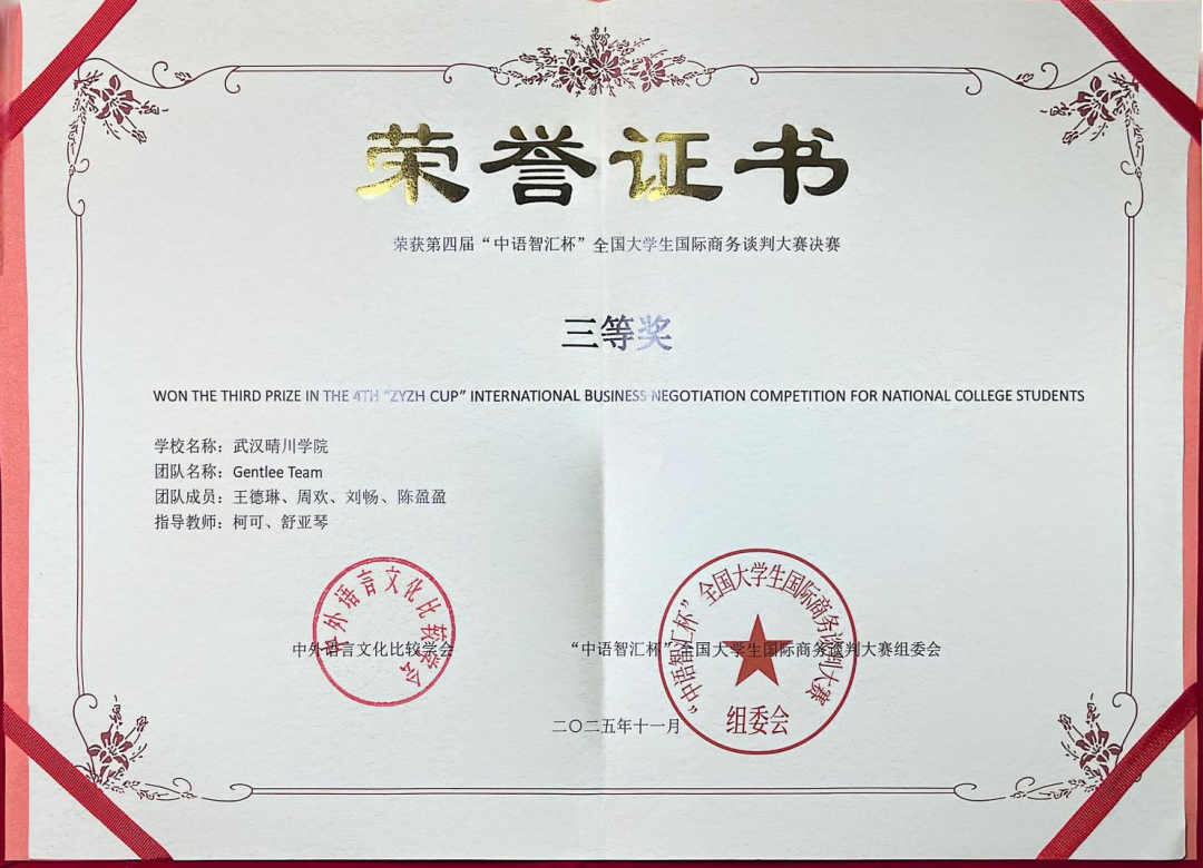 本次大赛由中外语言文化比较学会及赛事组委会联合主办,旨在推动高校国际商务谈判人才培养与课程体系建设。全国总决赛采用线上面对面谈判的形式,分三轮进行,全面考察参赛选手的商务知识储备、逻辑思维、团队协作与临场应变能力。晴川学子在比赛中沉着冷静、配合默契,展现了扎实的专业素养与良好的精神风貌。