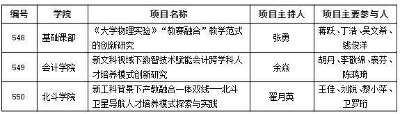 此次获批项目分别为:基础课部张勇老师主持的《〈大学物理实验〉“教赛融合”教学范式的创新研究》、会计学院余焱老师主持的《新文科视域下数智技术赋能会计跨学科人才培养模式创新研究》,以及北斗学院翟月英老师主持的《新工科背景下产教融合一体双线——北斗卫星导航人才培养模式探索与实践》。这些项目紧密围绕“教赛融合”“数智技术赋能”“产教融合”等教育教学改革热点,体现了我校在教学模式创新与学科交叉融合上的前瞻布局。