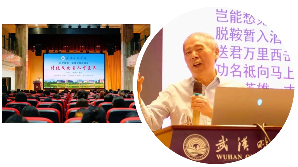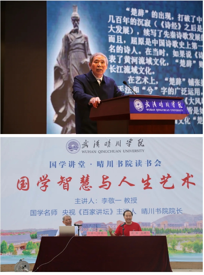 这是由国学名师、央视《百家讲坛》主讲人、晴川书院院长李敬一教授带来的“国学大讲堂”《中国传统节日的文化魅力——古典诗词与民俗风尚》专题讲座。从“爆竹声中一岁除,春风送暖入屠苏”的春节到“日暮汉宫传蜡烛,轻烟散入五侯家”的寒食,从“金风玉露一相逢,便胜却人间无数”的七夕到“岸容待腊将舒柳,山意冲寒欲放梅”的冬至,李敬一教授带领晴川师生漫溯中华民族数千年发展、传承的历史进程中,描绘民俗节日的经典诗句。吟诵到精妙之处,场下掌声雷动,经久不息。