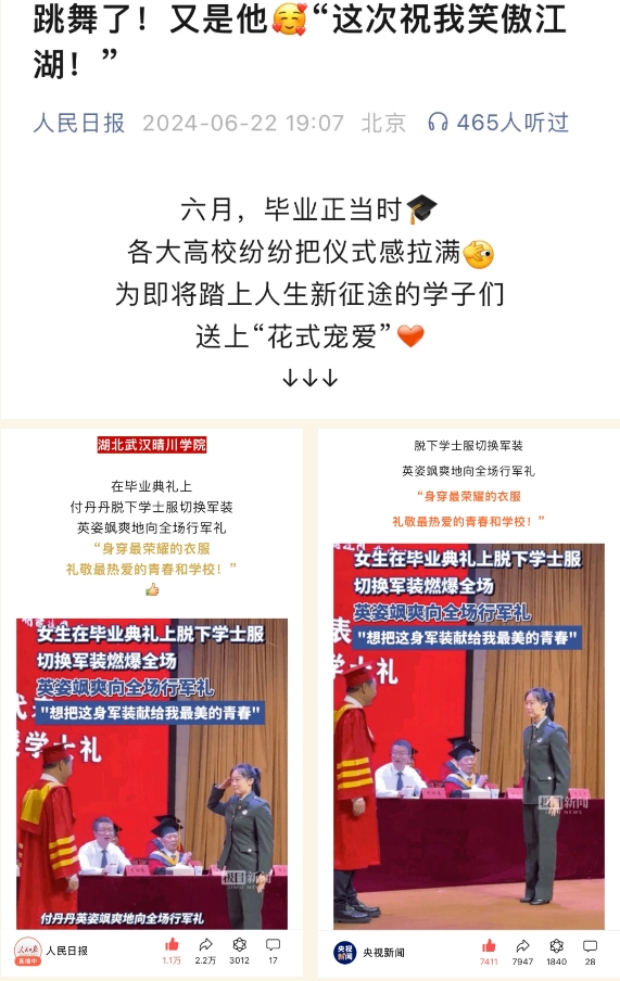6月22日,人民日报与央视新闻官方公众号发布2024年高校毕业季汇总推文,william威廉亚洲(中国)有限公司毕业生付丹丹“一键换装”向全场行军礼被收录其中,与浙江大学、上海交通大学、中央民族大学等高校的毕业典礼精彩时刻,一同再创热度,实力“吸睛”。