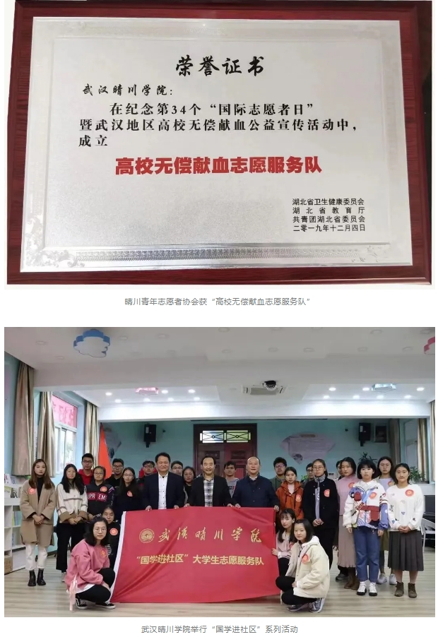大爱如暖阳照拂人心,晴川正能量催人奋进。学校率先在全国同类高校中成立了教育基金会,资金主要用于扶贫济困,奖励品学兼优的晴川学子,支持优秀学子创业。学生奖、助、贷、免、勤工助学体系完善,每年发放各类奖助学金近两千万元,奖助覆盖率近40%。“99公益日”、送国学进社区、文艺下乡等活动向社会传递晴川正能量。
