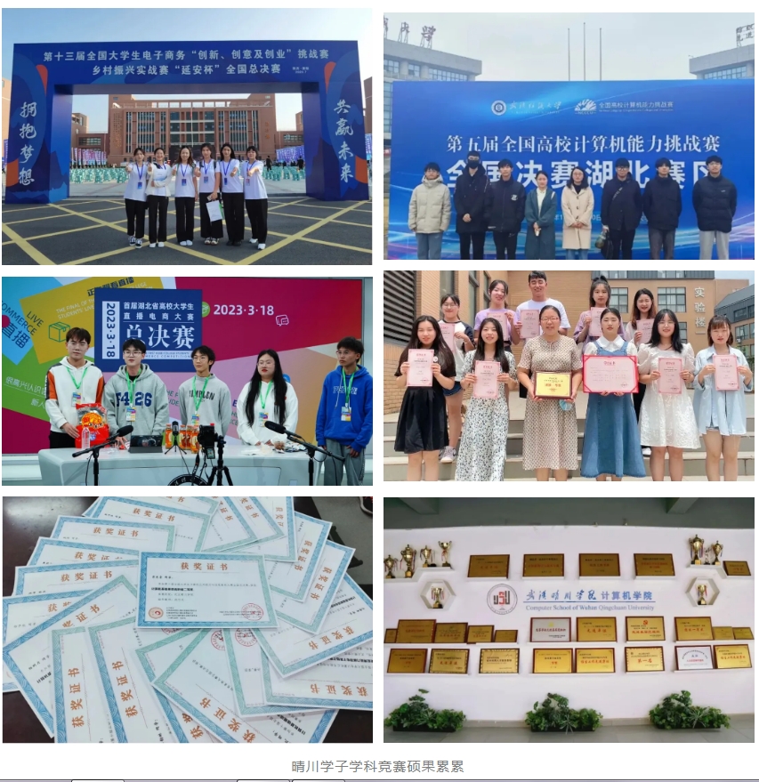 在晴川,勤耕力学的榜样无处不在。近年来,晴川学子在全国29类学科竞赛中获2000余项国家级、省级奖项,软件设计、电子商务、机械电气等学科竞赛成绩可与部分“双一流”高校媲美,其中计算机类竞赛成绩位列全国top24%,居全国本科高校前列。每年近200名学生考研“上岸”“双一流”高校,考取武汉大学、华中科技大学、南开大学等高校研究生。历届学子中,有的就职于世界500强和国有企事业单位,有的选择参军入伍、支援边疆、自主创业、到基层淬炼、在一线闪光,等等。
