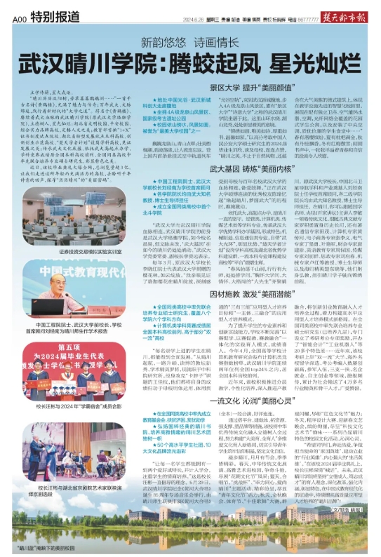 “锦绣如画、唯美如诗、厚重如书、温馨如家。”以高分考取中国人民公安大学硕士研究生的2024届毕业生刘欣,谈及母校,连连点赞,“晴川之美,不止于自然风物,还蕴含在大气美雅的德式建筑上,体现在教学设施先进的智慧化校园里,展现在配有独立卫浴、空气能热水器、空调,光纤网络全覆盖的花园式学生公寓以及安装了中央空调、质优价廉的学生食堂中……”春有落樱缤纷,夏有枇杷满金,秋有丹桂飘香,冬有红梅傲雪;朗朗书声中,一张张洋溢着青春和自信的脸庞令人欣慰。