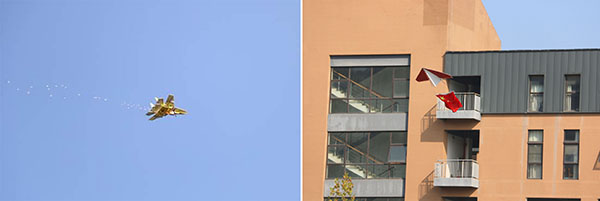 “呜……”一阵低沉的轰鸣声响起,一架无人机带着五彩缤纷的尾烟出现在操场上空,竹蜻蜓飞行协会为代表团带来一场精彩绝伦的飞行表演。协会成员彭虎校、李祖庆、王德昌、表演运20、歼-11护航拉烟编队,一出场就获得了大家的关注。“太不可思议了!”外宾们纷纷点赞。随后,黄爽进行花式飞行表演,展示倒飞、英麦迈、横滚等各种特技动作。最后由方雪儿、楚金海带来飞机载国旗、苏-27冷焰火护航,圆满结束飞行表演。