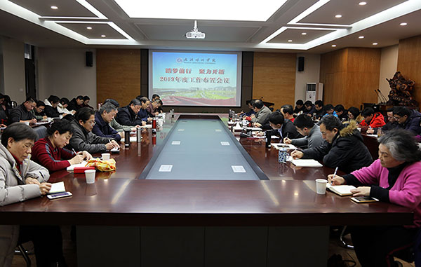 校长胡西伟从五个方面部署了学校2019年30项重点工作。一是党的建设与思想政治教育工作,要始终坚持立德树人宗旨,深入开展学习习近平新时代中国特色社会主义思想活动,将思想政治工作贯穿教育教学全过程。二是人才培养工作,要继续深化教育教学改革,巩固教学中心地位;加强优质生源基地建设,提高生源质量;推进创新创业教育,提升就业率。三是内涵发展方面,进一步加大师资队伍建设,推进本科教学工作合格评估工作;根据经济社会发展新形势新需求调整专业设置,创建特色品牌专业;启动核心课程建设,打造“金课”,做好专业学位硕士培养及科研工作,丰富“五个晴川”为内涵的校园文化建设,提升核心竞争力。四是内部管理改革,以制度落实为重点,统筹有序推进学校各项改革工作,推进科研工作评价机制改革,提升机关管理服务效能,提高服务中心工作水平。五是办学资源管理方面,要进一步加强统筹协调,加快智慧校园、平安校园建设及校园基础设施建设,增强学校发展的条件支撑力。