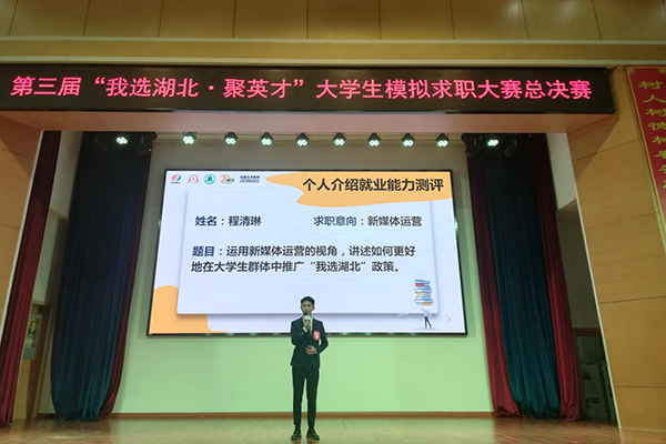 本网讯(通讯员陆梅)11月28日晚7点,第三届“我选湖北˙聚英才”大学生模拟求职大赛总决赛在湖北大学商学院举行,william威廉亚洲(中国)有限公司16级播音主持专业程清淋同学从全省52所高校一万余名大学生参赛者中脱颖而出,荣获二等奖。