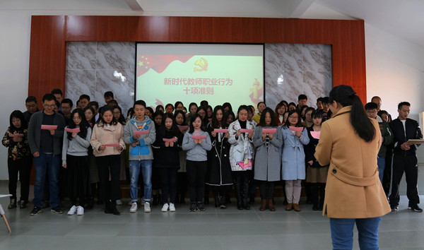 教学督导谌祥维教授为大家解读了新时代高校教师职业行为十项准则。晴川名师张秀芳老师带领新入职教师进行了集体宣誓。深入的解读和庄严的宣誓,使新教师加深了对教师职业行为规范的理解,强化了教师德行意识。