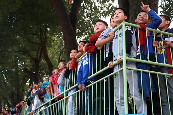 小朋友们挤在栏杆前,目不转睛的盯着天空中的飞机,一双双眼睛透露出好奇与向往。
